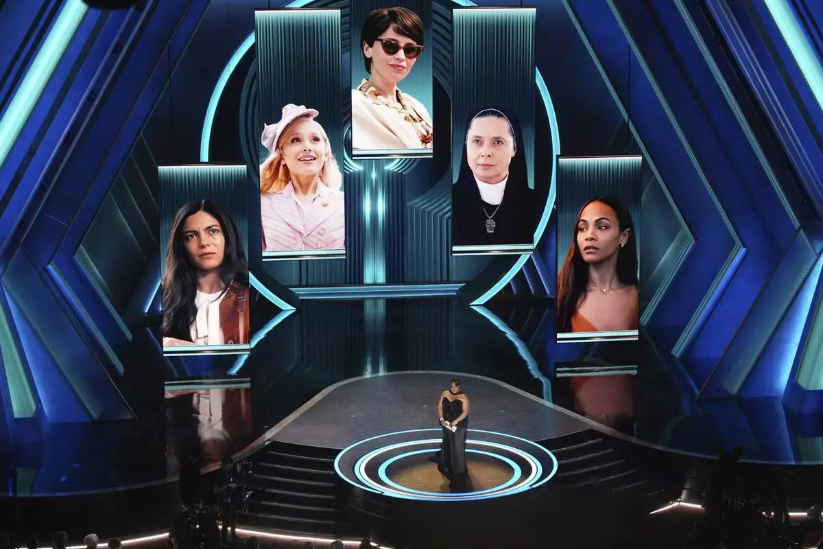 Zoe Saldana presents the award for best cinematography during the Oscars on Sunday, March 2, 2025, at the Dolby Theatre in Los Angeles. (AP Photo/Chris Pizzello)