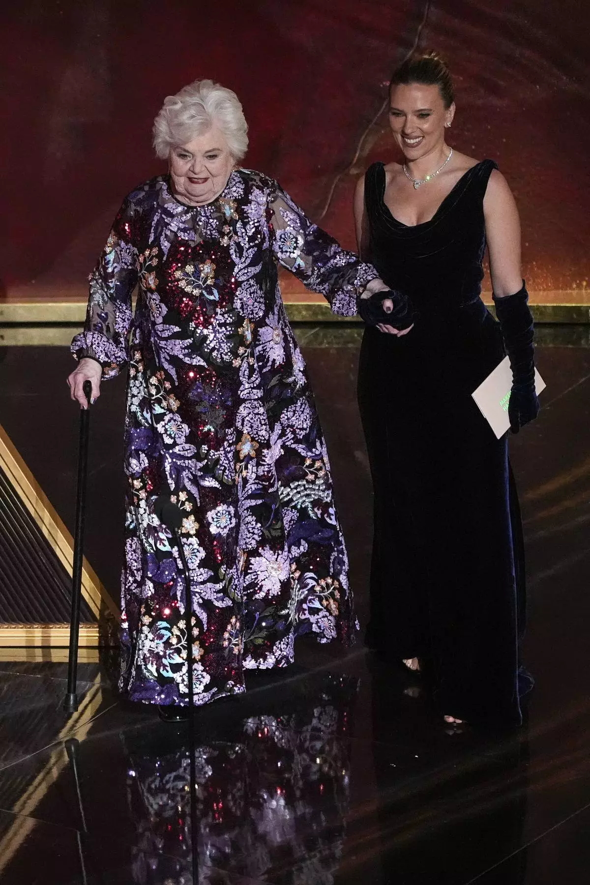 June Squibb, left, and Scarlett Johannson presents the award for best makeup and hairstyling during the Oscars on Sunday, March 2, 2025, at the Dolby Theatre in Los Angeles. (AP Photo/Chris Pizzello)