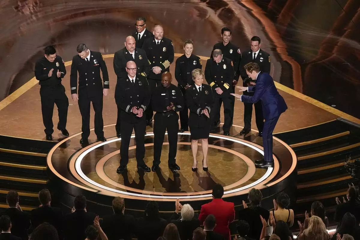 Members of the Los Angeles County Fire Department and Host Conan O'Brien, far right, on stage during the Oscars on Sunday, March 2, 2025, at the Dolby Theatre in Los Angeles. (AP Photo/Chris Pizzello)