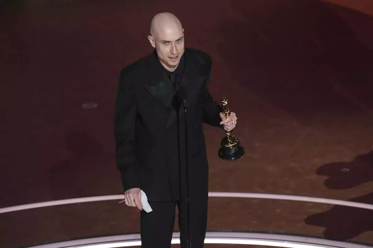 Daniel Blumberg accepts the award for best original score for "The Brutalist" during the Oscars on Sunday, March 2, 2025, at the Dolby Theatre in Los Angeles. (AP Photo/Chris Pizzello)