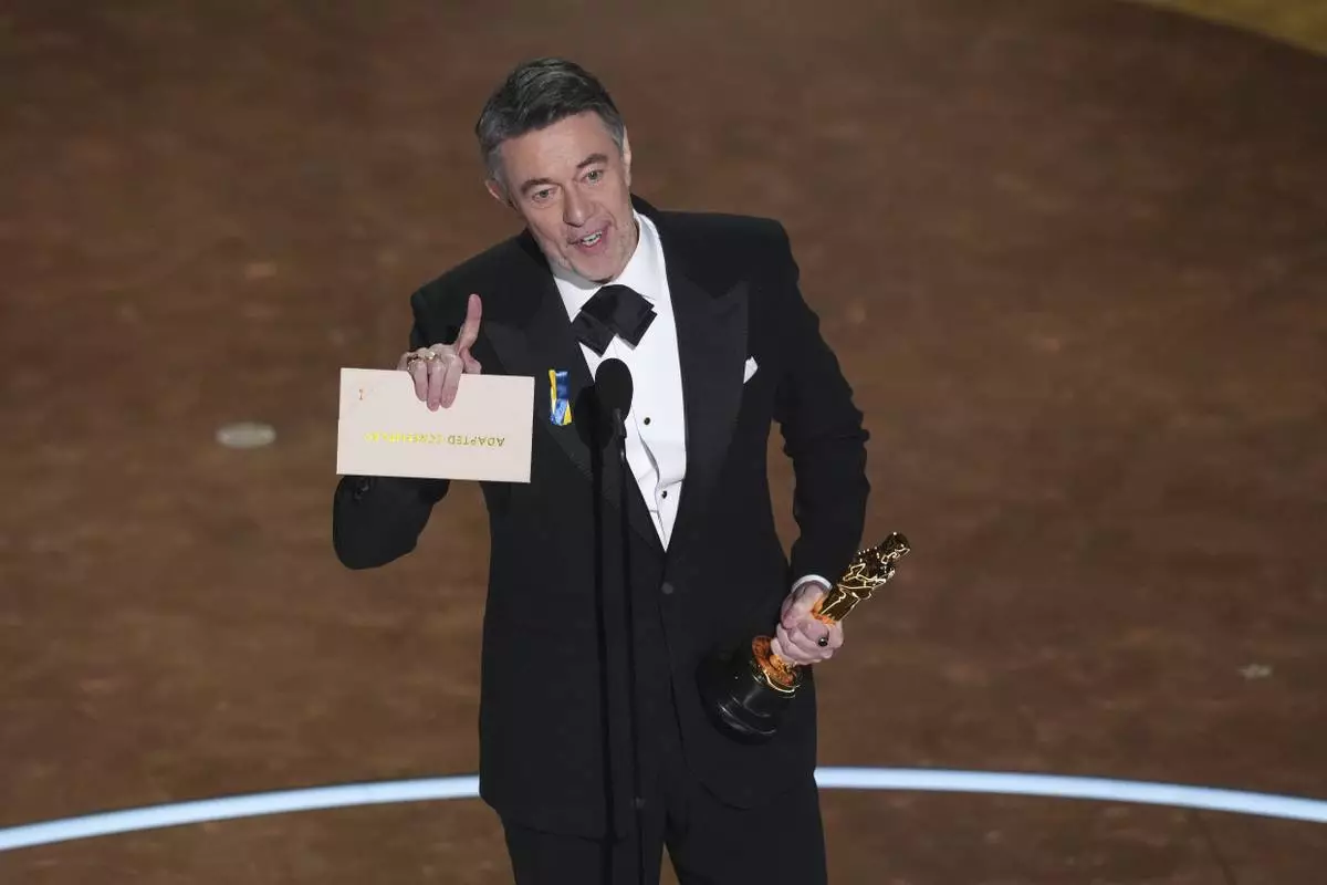 Peter Straughan accepts the award for best adapted screenplay for "Conclave" during the Oscars on Sunday, March 2, 2025, at the Dolby Theatre in Los Angeles. (AP Photo/Chris Pizzello)