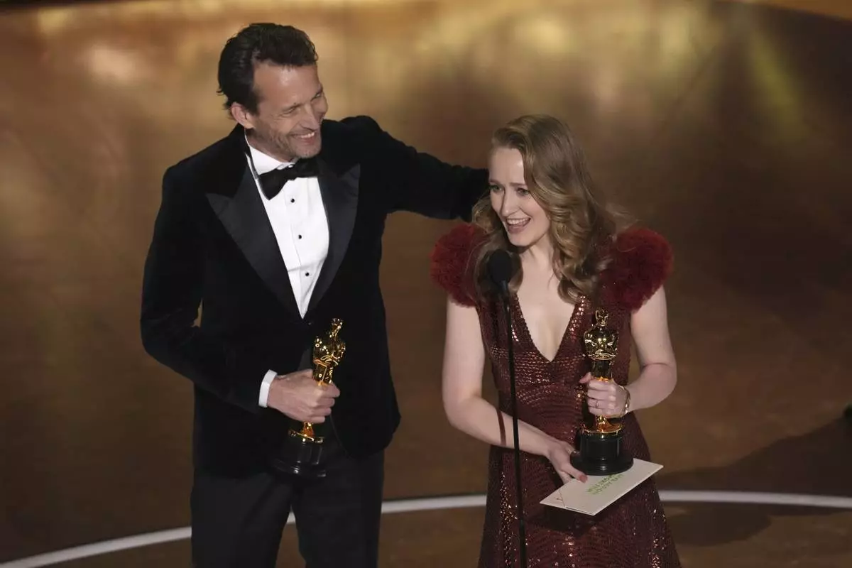Trent, left, and Victoria Warmerdam accept the award for best live action short film for "I'm Not a Robot" during the Oscars on Sunday, March 2, 2025, at the Dolby Theatre in Los Angeles. (AP Photo/Chris Pizzello)