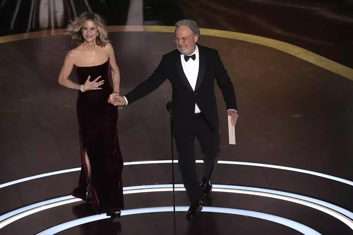 Meg Ryan, left, and Billy Crystal presents the award for best picture during the Oscars on Sunday, March 2, 2025, at the Dolby Theatre in Los Angeles. (AP Photo/Chris Pizzello)