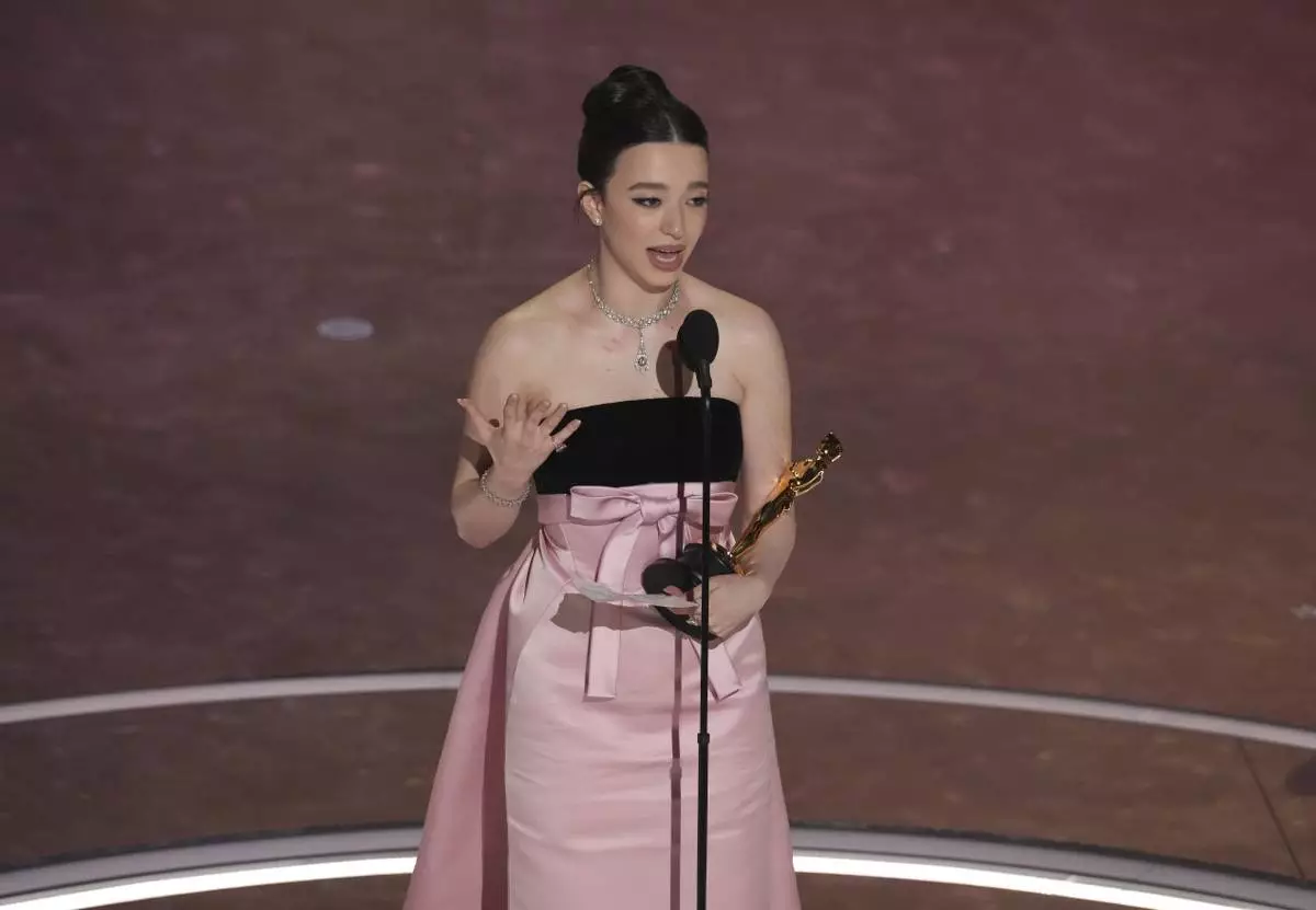 Mikey Madison accepts the award for best performance by an actress in a leading role for "Anora" during the Oscars on Sunday, March 2, 2025, at the Dolby Theatre in Los Angeles. (AP Photo/Chris Pizzello)