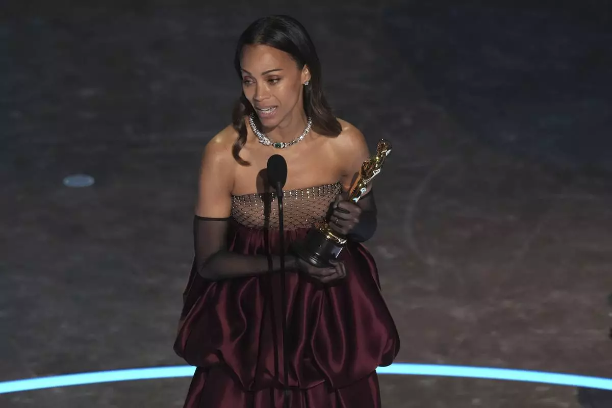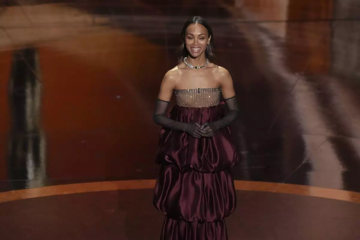 Zoe Saldana accepts the award for best performance by an actress in a supporting role for "Emilia Perez" during the Oscars on Sunday, March 2, 2025, at the Dolby Theatre in Los Angeles. (AP Photo/Chris Pizzello)