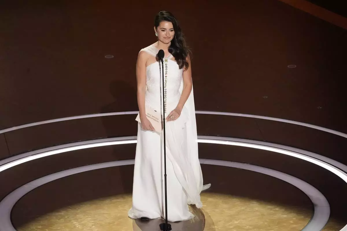 Penelope Cruz presents the award for best international feature film during the Oscars on Sunday, March 2, 2025, at the Dolby Theatre in Los Angeles. (AP Photo/Chris Pizzello)