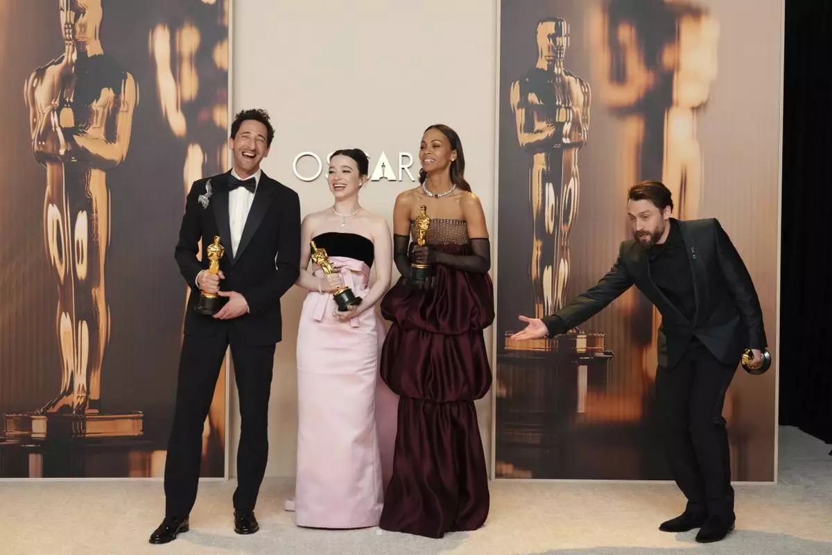 Adrien Brody, from left, winner of the award for best performance by an actor in a leading role for "The Brutalist," Mikey Madison, winner of the award for best performance by an actress in a leading role for "Anora," Zoe Saldana, winner of the award for best performance by an actress in a supporting role for "Emilia Perez," and Kieran Culkin, winner of the award for best performance by an actor in a supporting role for "A Real Pain," pose in the press room at the Oscars on Sunday, March 2, 2025, at the Dolby Theatre in Los Angeles. (Photo by Jordan Strauss/Invision/AP)