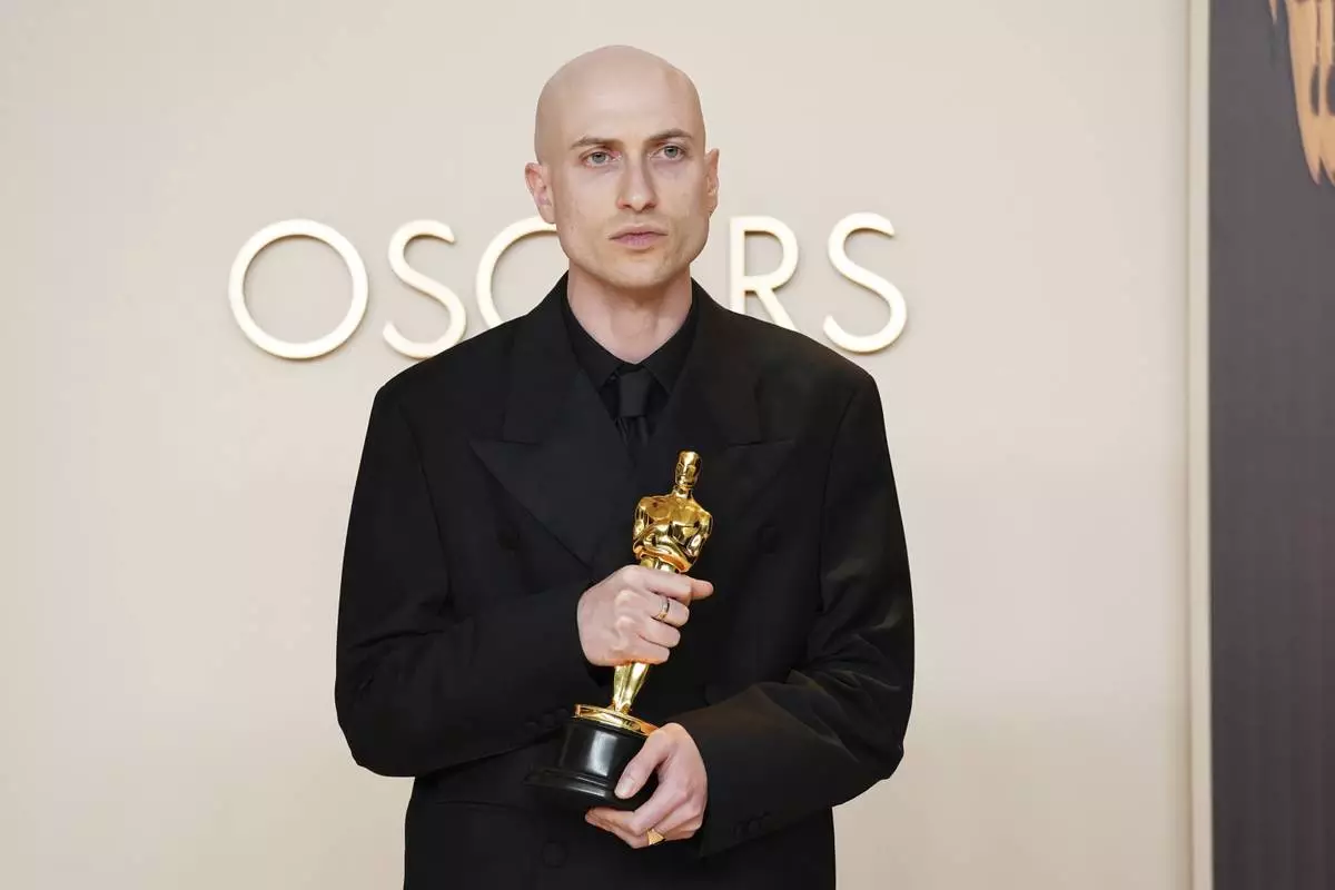 Daniel Blumberg, winner of the award for best original score for "The Brutalist," poses in the press room at the Oscars on Sunday, March 2, 2025, at the Dolby Theatre in Los Angeles. (Photo by Jordan Strauss/Invision/AP)