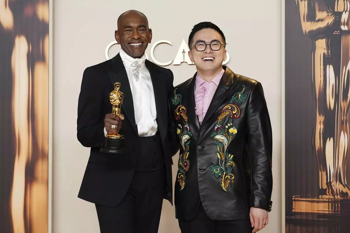 Paul Tazewell, left, winner of the award for best costume design for "Wicked," poses in the press room with Bowen Yang at the Oscars on Sunday, March 2, 2025, at the Dolby Theatre in Los Angeles. (Photo by Jordan Strauss/Invision/AP)