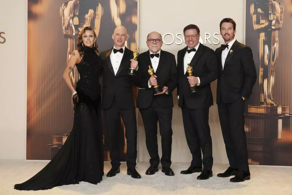 Miley Cyrus, left, and Miles Teller, right, pose with Gareth John, second from left, Richard King, and Ron Bartlett, winners of the award for best sound for "Dune: Part Two," in the press room at the Oscars on Sunday, March 2, 2025, at the Dolby Theatre in Los Angeles. (Photo by Jordan Strauss/Invision/AP)