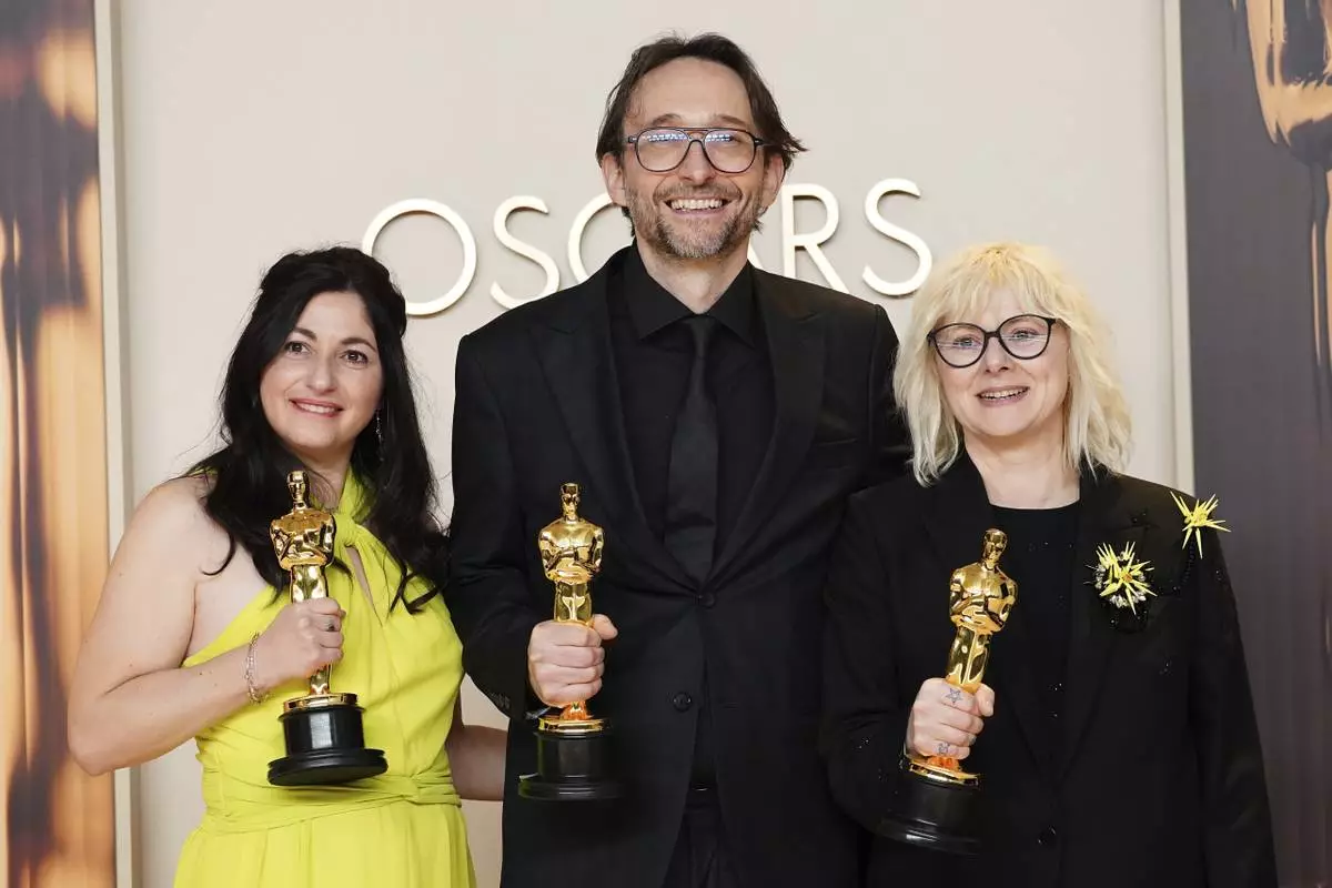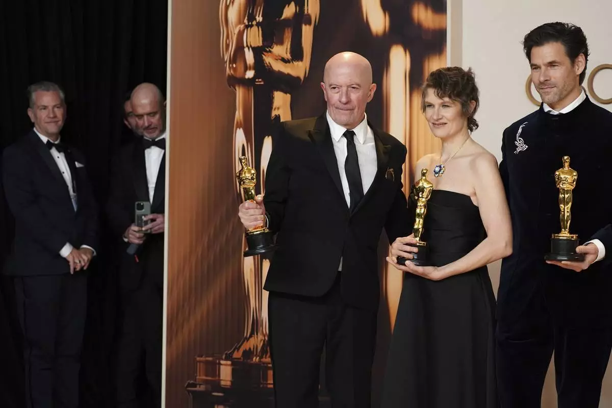 Alex Coco, from left, winner of the award for best picture for "Anora," Sean Baker, winner of the awards for best original screenplay, best film editing, best director, and best picture for "Anora," and Samantha Quan, winner of the award for best picture for "Anora," pose in the press room at the Oscars on Sunday, March 2, 2025, at the Dolby Theatre in Los Angeles. (Photo by Jordan Strauss/Invision/AP)