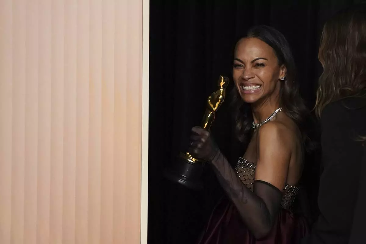 Zoe Saldana, winner of the award for best performance by an actress in a supporting role for "Emilia Perez," poses in the press room at the Oscars on Sunday, March 2, 2025, at the Dolby Theatre in Los Angeles. (Photo by Jordan Strauss/Invision/AP)