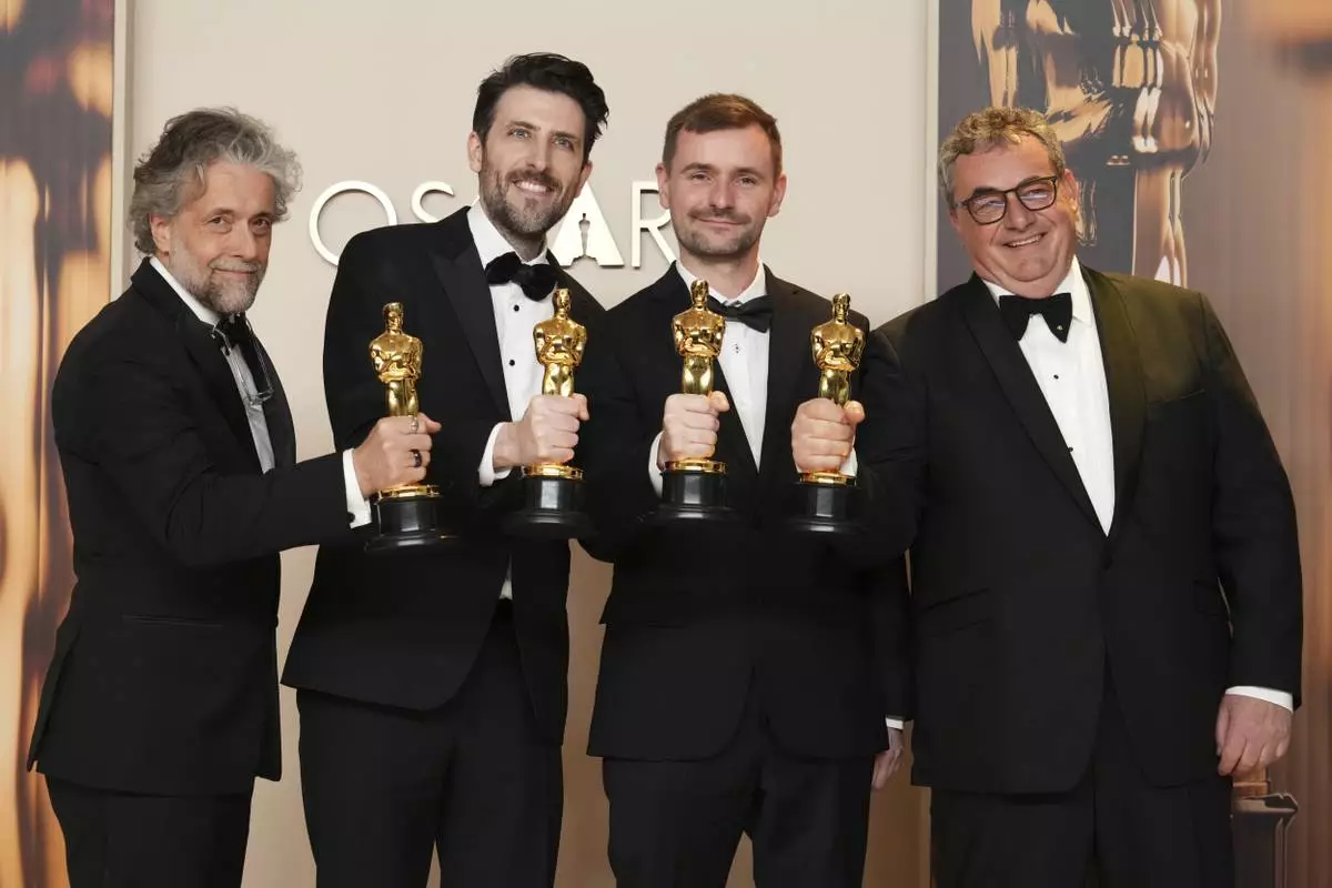 From left, Gints Zilbalodis, Matiss Kaza, Ron Dyens and Gregory Zalcman, winners of the award for best animated feature film for "Flow," pose in the press room at the Oscars on Sunday, March 2, 2025, at the Dolby Theatre in Los Angeles. (Photo by Jordan Strauss/Invision/AP)