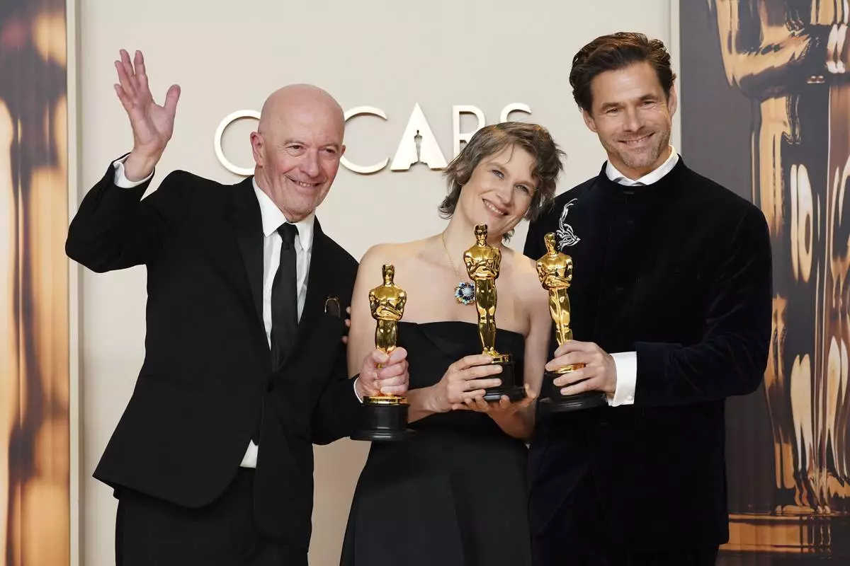 Jacques Audiard, from left, Camille, and Clement Ducol, winners of the award for best original song for "El Mal" from" Emilia Perez," pose in the press room at the Oscars on Sunday, March 2, 2025, at the Dolby Theatre in Los Angeles. (Photo by Jordan Strauss/Invision/AP)