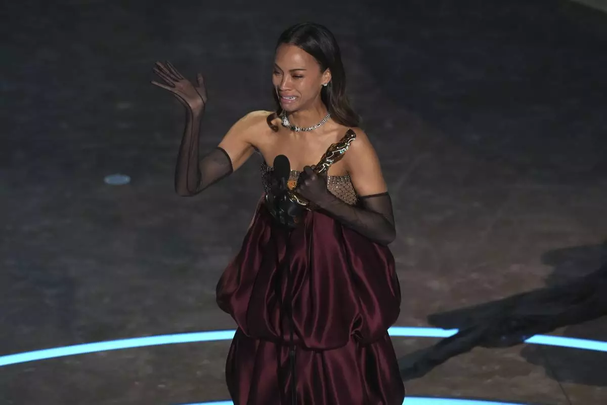 Zoe Saldana accepts the award for best performance by an actress in a supporting role for "Emilia Perez" during the Oscars on Sunday, March 2, 2025, at the Dolby Theatre in Los Angeles. (AP Photo/Chris Pizzello)
