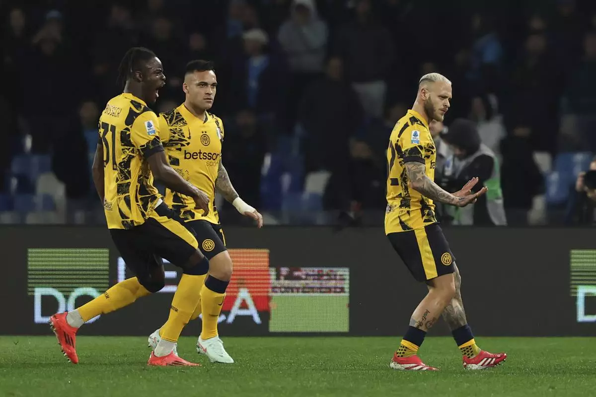 Inter Milan's Federico Dimarco celebrates after scoring his side's opening goal during the Serie A soccer match between Napoli and Inter Milan, at the Naples Diego Armando Maradona stadium, Italy, Saturday March 1, 2025. (Alfredo Falcone/LaPresse via AP)