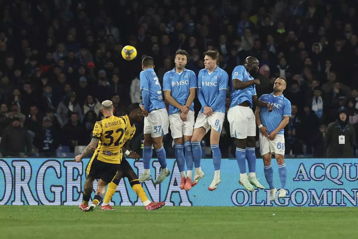 Inter Milan's Federico Dimarco scores on a free-kick during the Serie A soccer match between Napoli and Inter Milan, at the Naples Diego Armando Maradona stadium, Italy, Saturday March 1, 2025. (Alessandro Garofalo/LaPresse via AP)
