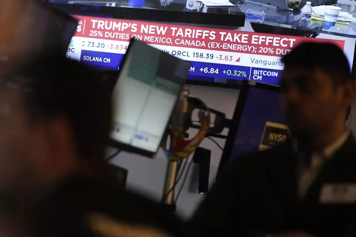 Financial news is displayed as people work on the floor at the New York Stock Exchange in New York, Tuesday, March 4, 2025. (AP Photo/Seth Wenig)
