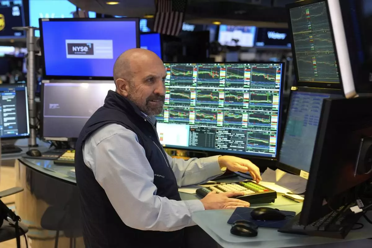 People work on the floor at the New York Stock Exchange in New York, Tuesday, March 4, 2025. (AP Photo/Seth Wenig)