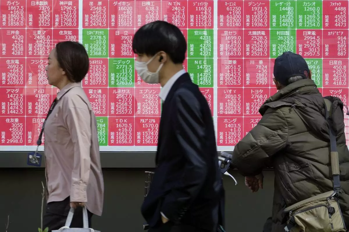 People walk in front of an electronic stock board showing Japan's Nikkei index at a securities firm Thursday, Feb. 27, 2025, in Tokyo. (AP Photo/Eugene Hoshiko)