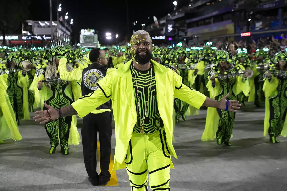The drum director from the Mocidade samba school gestures during Carnival celebrations at the Sambadrome in Rio de Janeiro, Tuesday, March 4, 2025. (AP Photo/Bruna Prado)