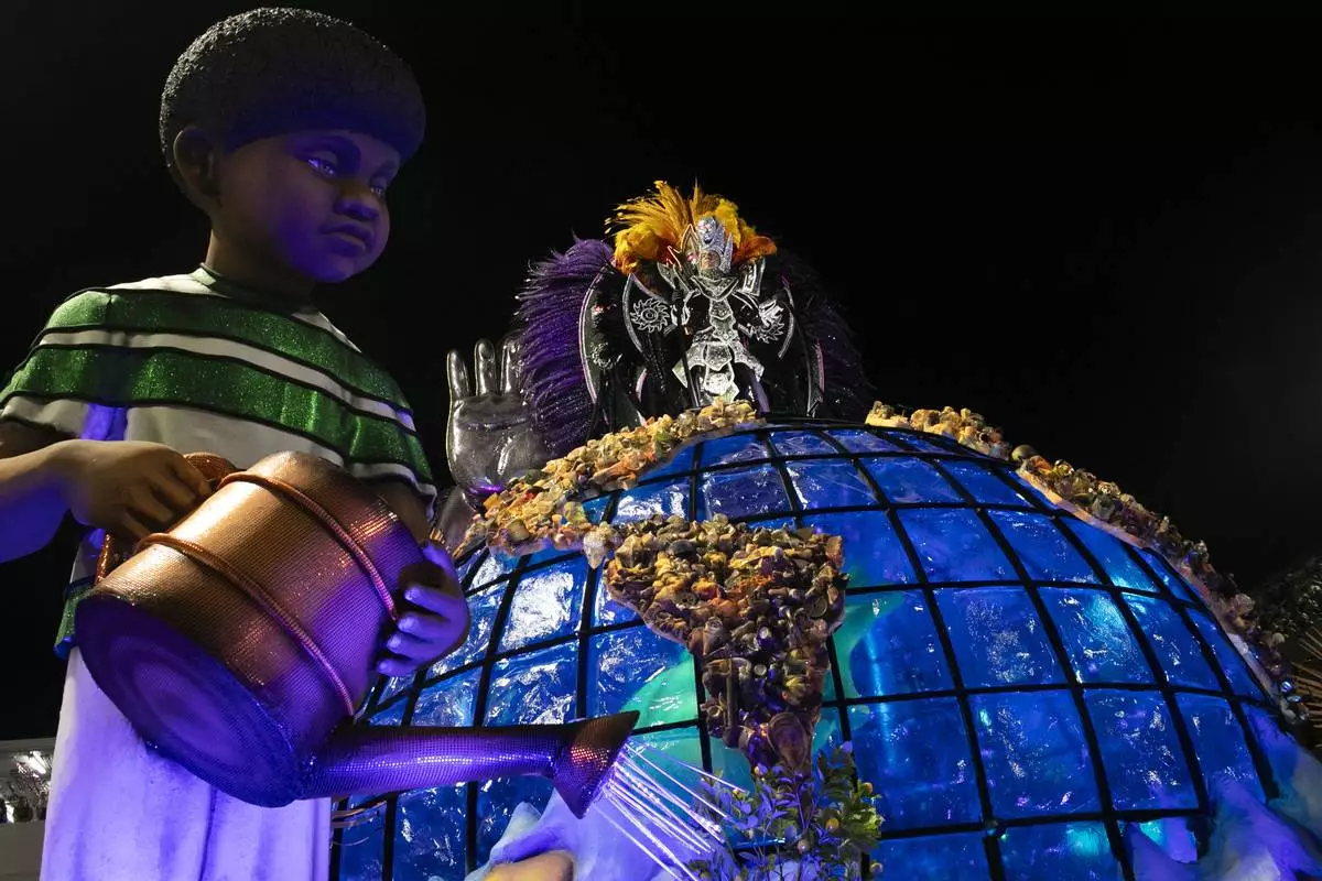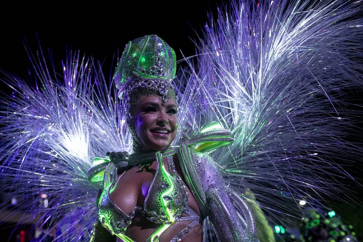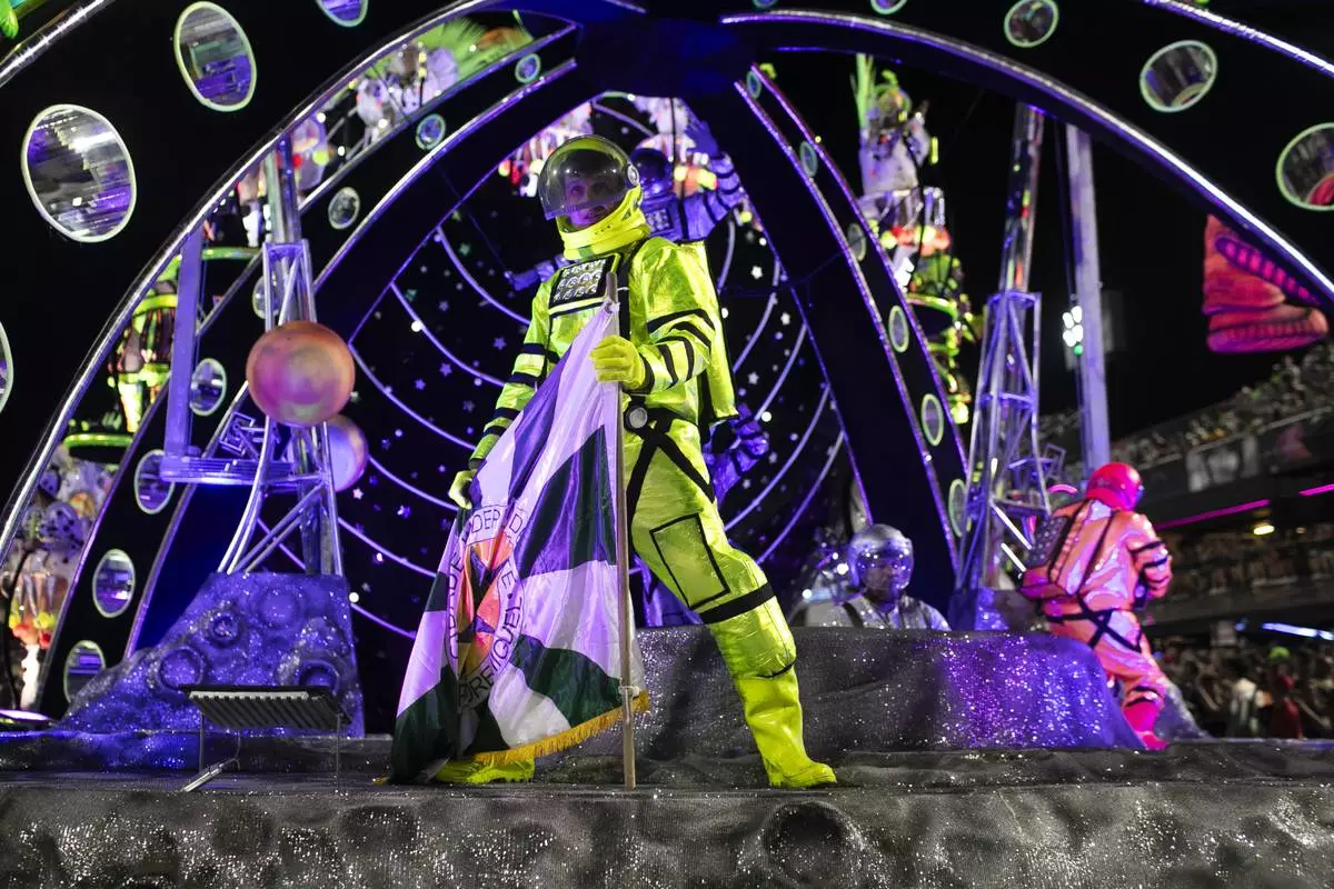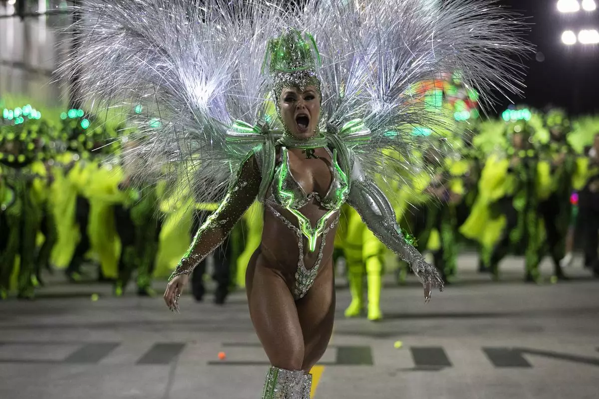 A performer from the Mocidade samba school dances on a float during Carnival celebrations at the Sambadrome in Rio de Janeiro, Tuesday, March 4, 2025. (AP Photo/Bruna Prado)