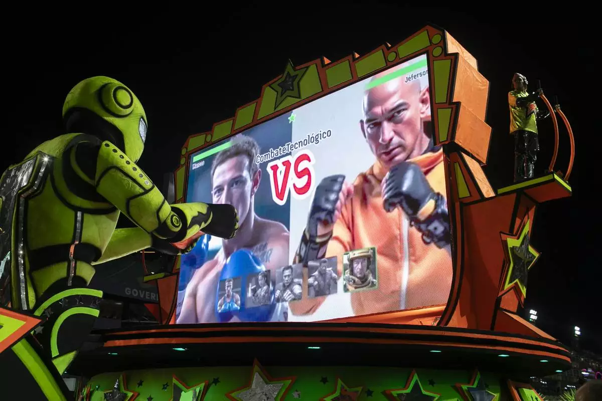 A performer from the Mocidade samba school directs a float alongside artificial intelligence images of Meta CEO Mark Zuckerberg, left, and Amazon CEO Jeff Bezos during Carnival celebrations at the Sambadrome in Rio de Janeiro, Tuesday, March 4, 2025. (AP Photo/Bruna Prado)