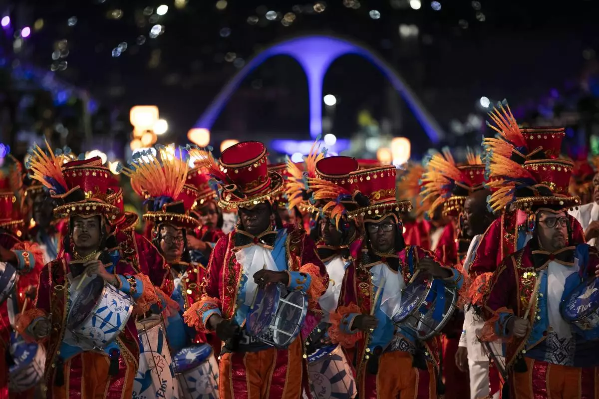 Musicians from the Beija-Flor samba school perform during Carnival celebrations at the Sambadrome in Rio de Janeiro, Monday, March 3, 2025. (AP Photo/Bruna Prado)
