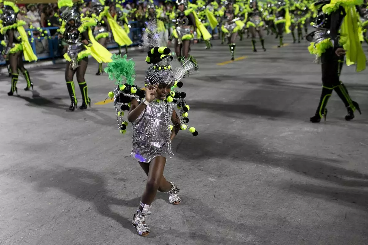 A performer from the Mocidade samba school dances during Carnival celebrations at the Sambadrome in Rio de Janeiro, Tuesday, March 4, 2025. (AP Photo/Bruna Prado)
