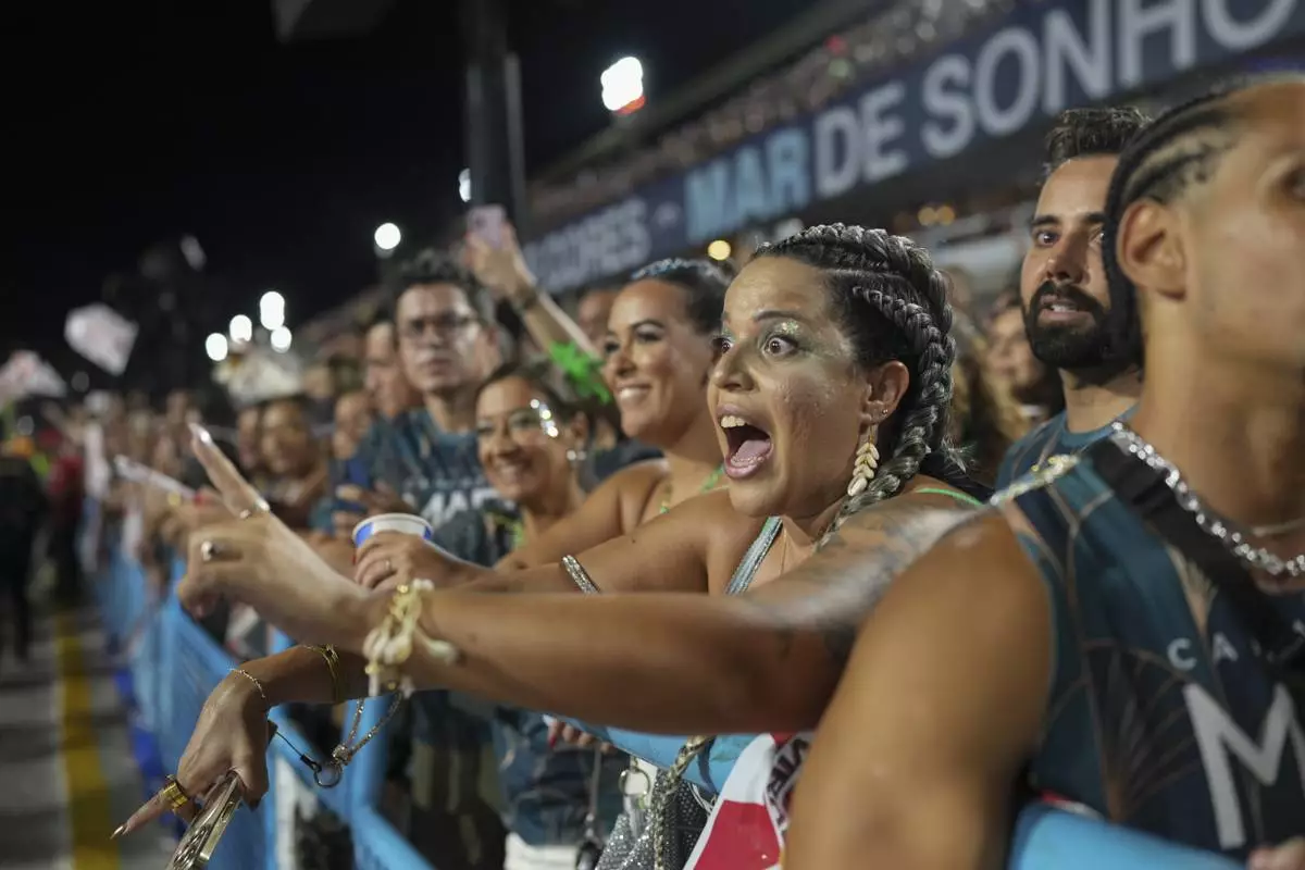 Fans cheer during the Viradouro samba school parade, during Carnival celebrations at the Sambadrome in Rio de Janeiro, Monday, March 3, 2025. (AP Photo/Silvia Izquierdo)