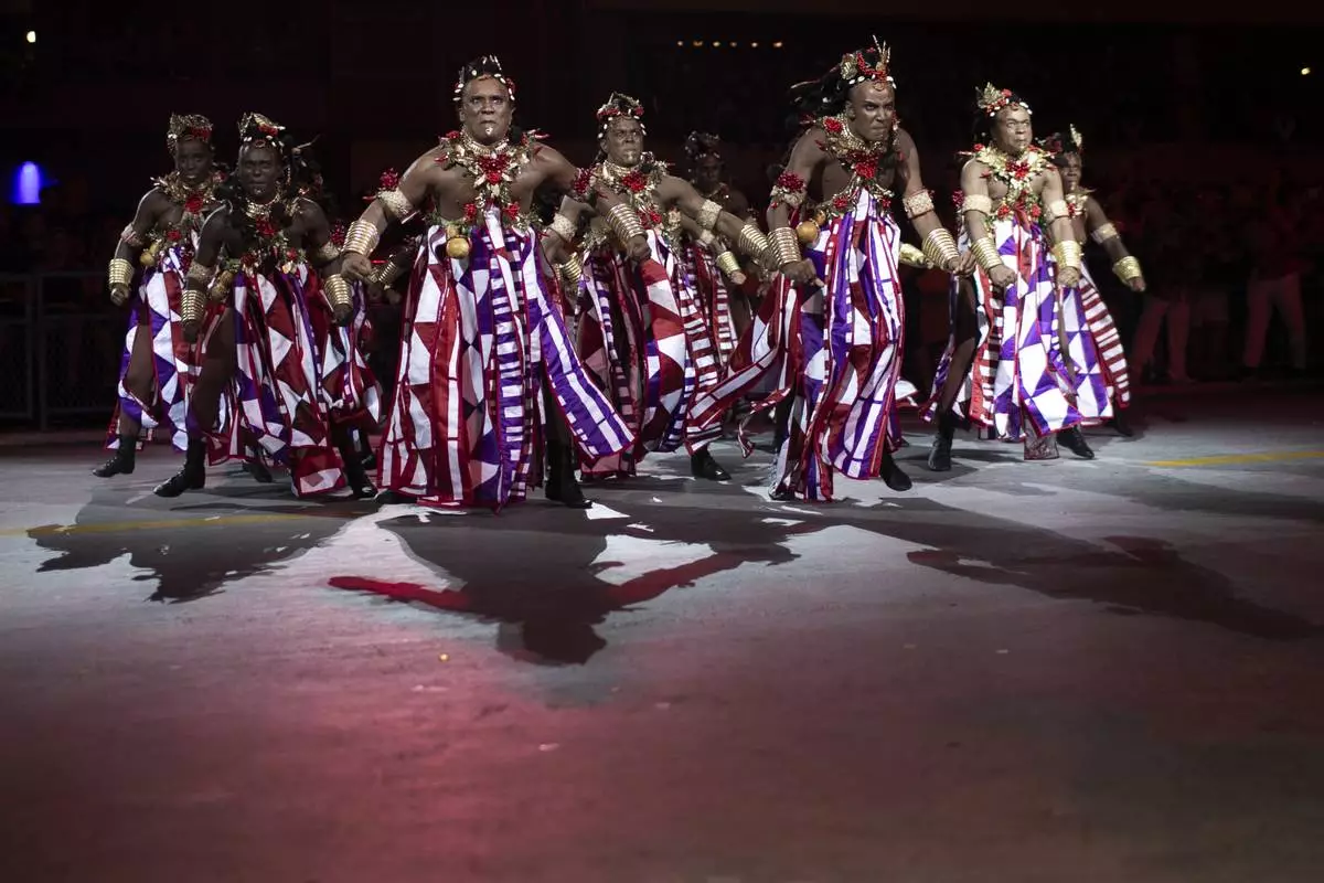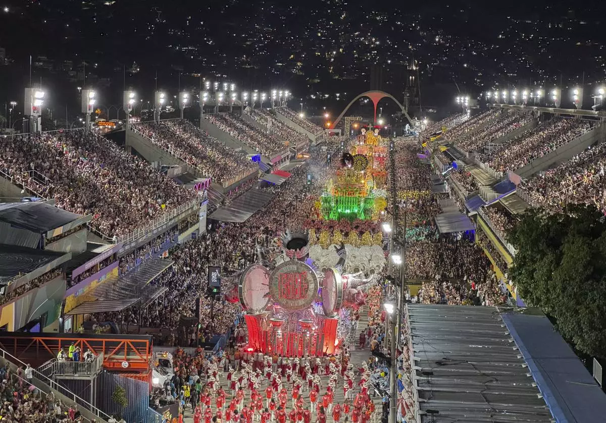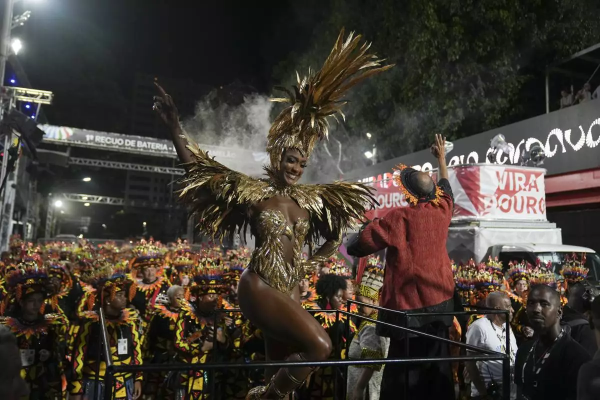 Performers from the Salgueiro samba school dance during Carnival celebrations at the Sambadrome in Rio de Janeiro, early Tuesday, March 4, 2025. (AP Photo/Bruna Prado)
