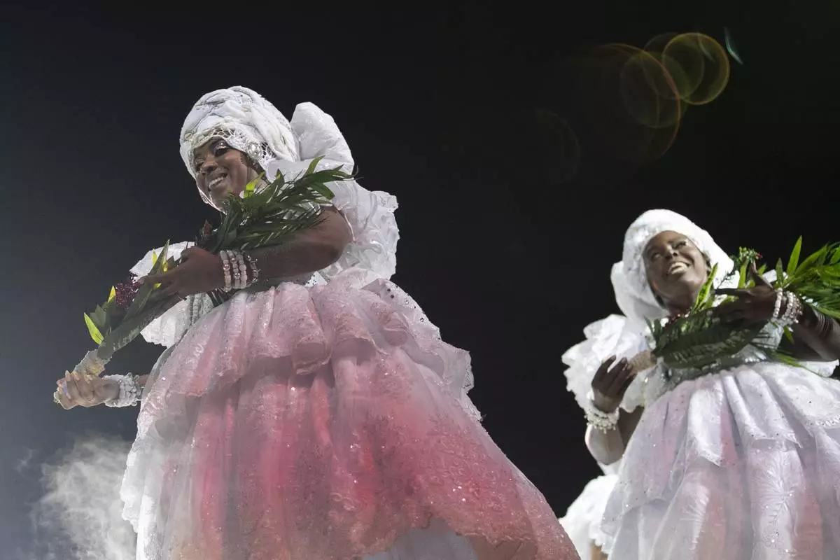 Performers from the Unidos de Padre Miguel samba school dance during Carnival celebrations at the Sambadrome in Rio de Janeiro, Sunday, March 2, 2025. (AP Photo/Silvia Izquierdo)
