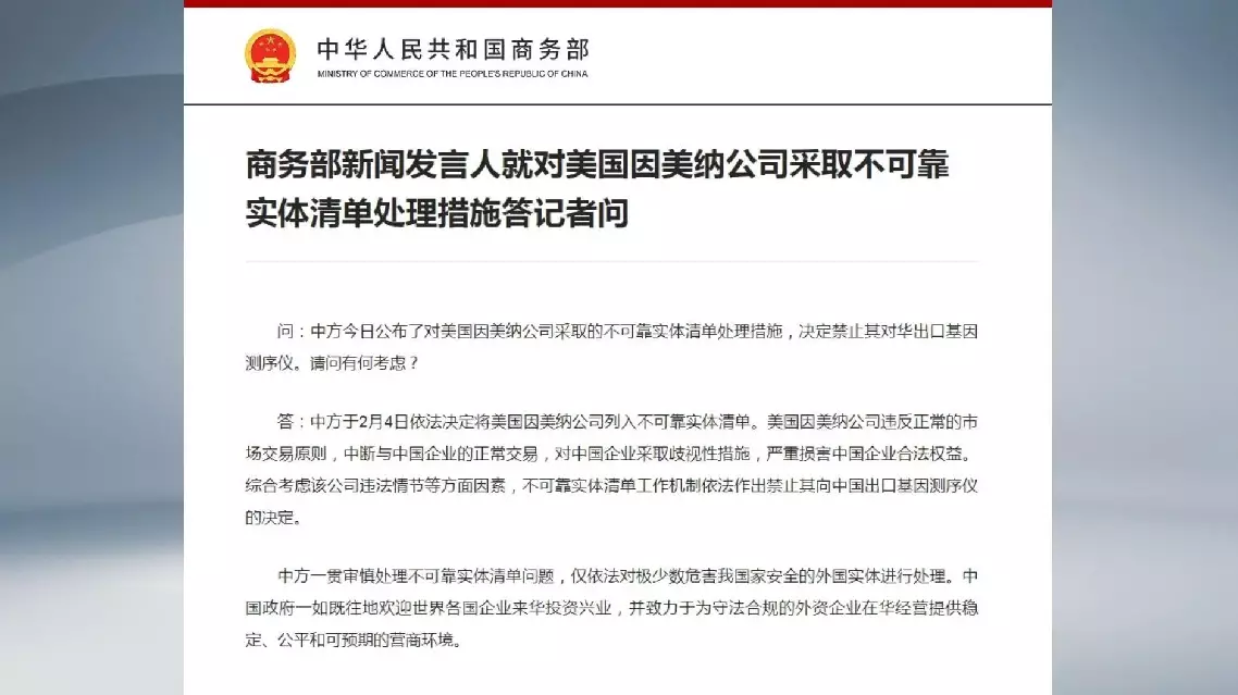 The spokesperson made the statement in response to a question about the ministry's decision on February 4 to add Illumina, Inc. to China's unreliable entity list.