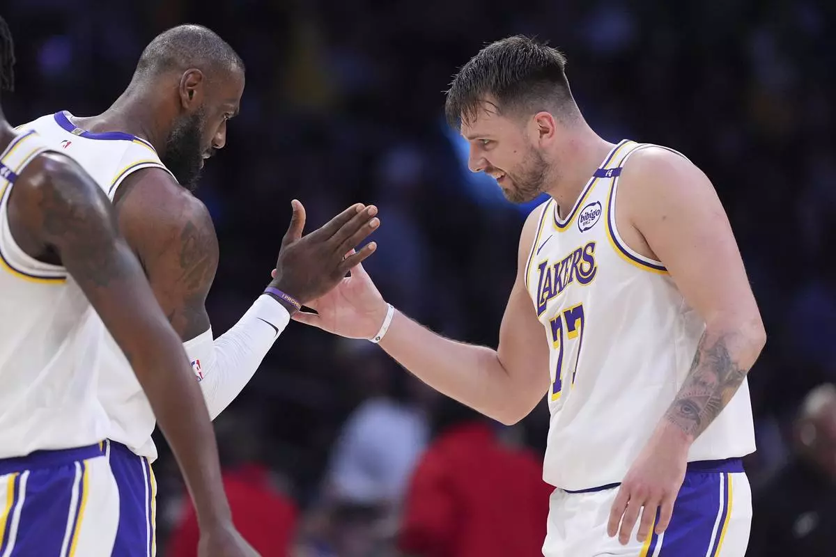 Los Angeles Lakers forward LeBron James, left, is congratulated by guard Luka Doncic after he scored during the first half of an NBA basketball game against the Minnesota Timberwolves, Thursday, Feb. 27, 2025, in Los Angeles. (AP Photo/Mark J. Terrill)