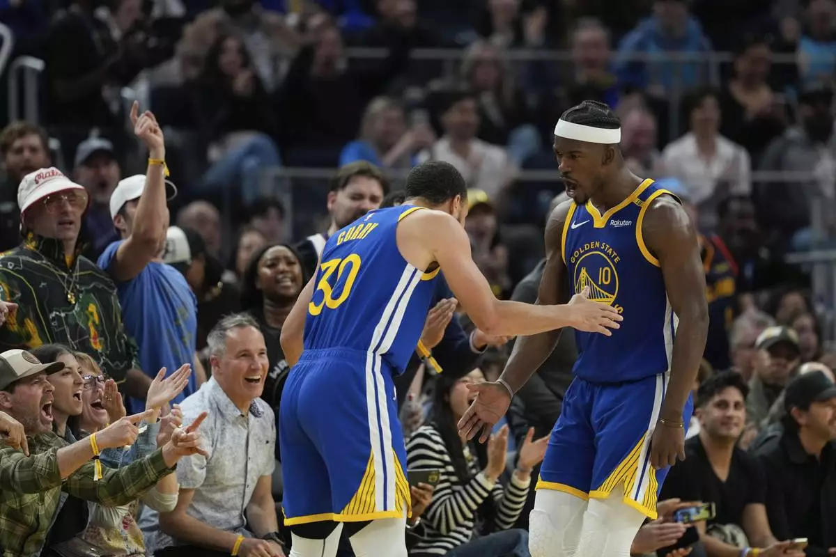 Golden State Warriors forward Jimmy Butler III, right, celebrates with guard Stephen Curry (30) after scoring during the first half of an NBA basketball game against the Dallas Mavericks, Sunday, Feb. 23, 2025, in San Francisco. (AP Photo/Godofredo A. Vásquez)