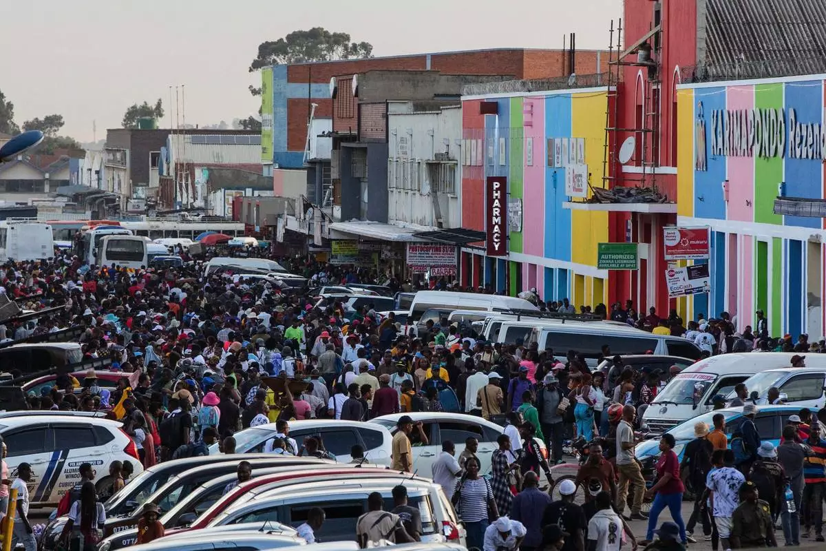 An overview of commuters at a minibus taxi area during rush hour in downtown Harare, Zimbabwe, Tuesday, Dec. 16, 2025.(AP Photo/Aaron Ufumeli)