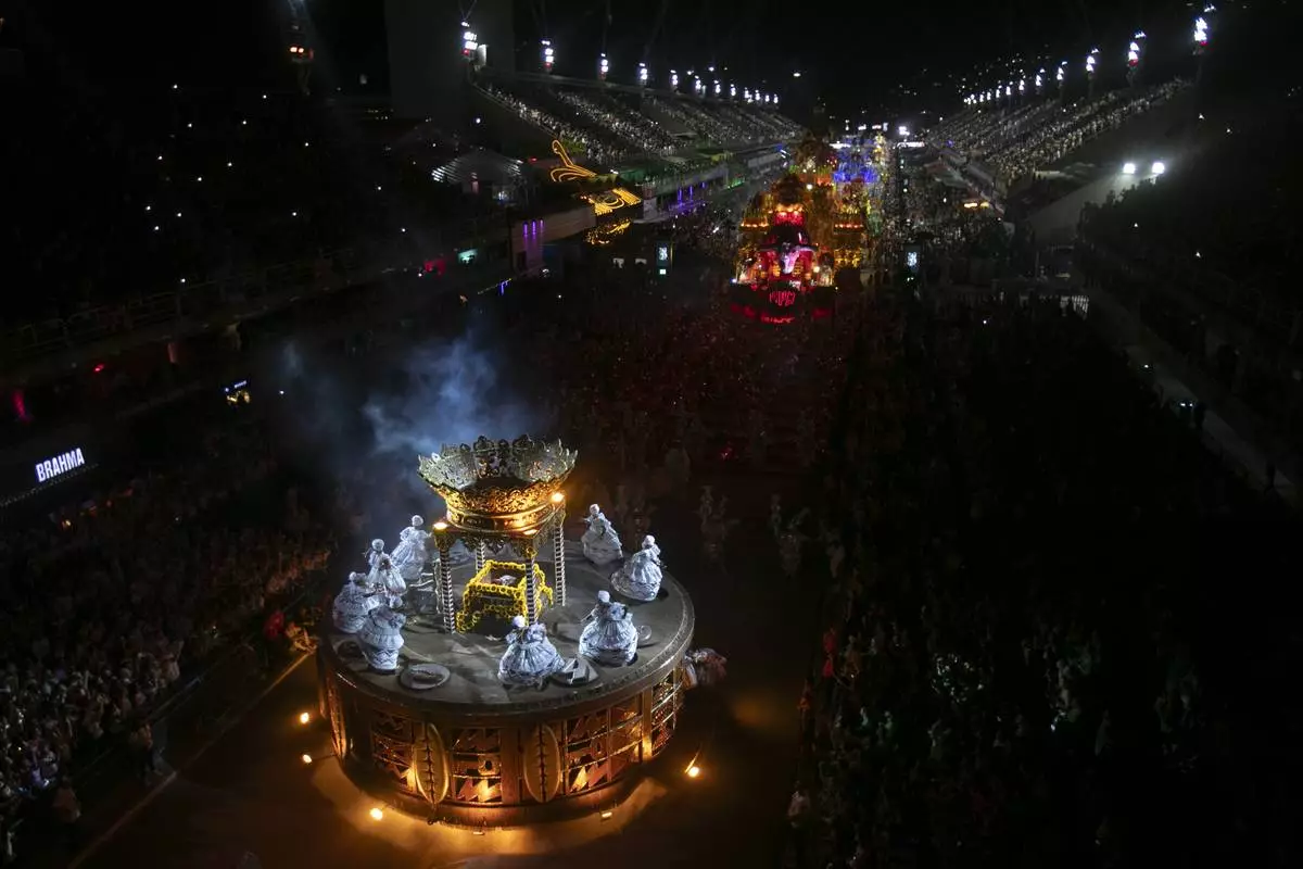 Dancers from the Colorado do Bras samba school perform during a carnival parade in Sao Paulo, Friday, Feb. 28, 2025. (AP Photo/Andre Penner)