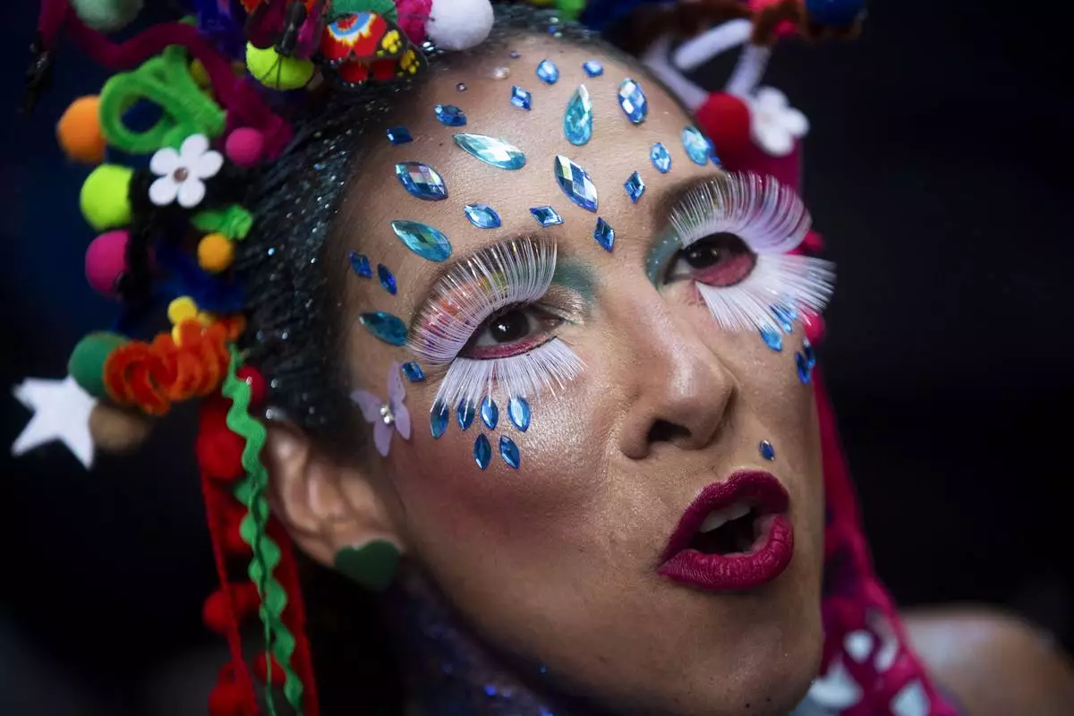 Transgender woman Negriny Venture rehearses at the Paraiso de Tuiuti samba school for the Carnival parade in Rio de Janeiro, Wednesday, Feb. 5, 2025. (AP Photo/Silvia Izquierdo)