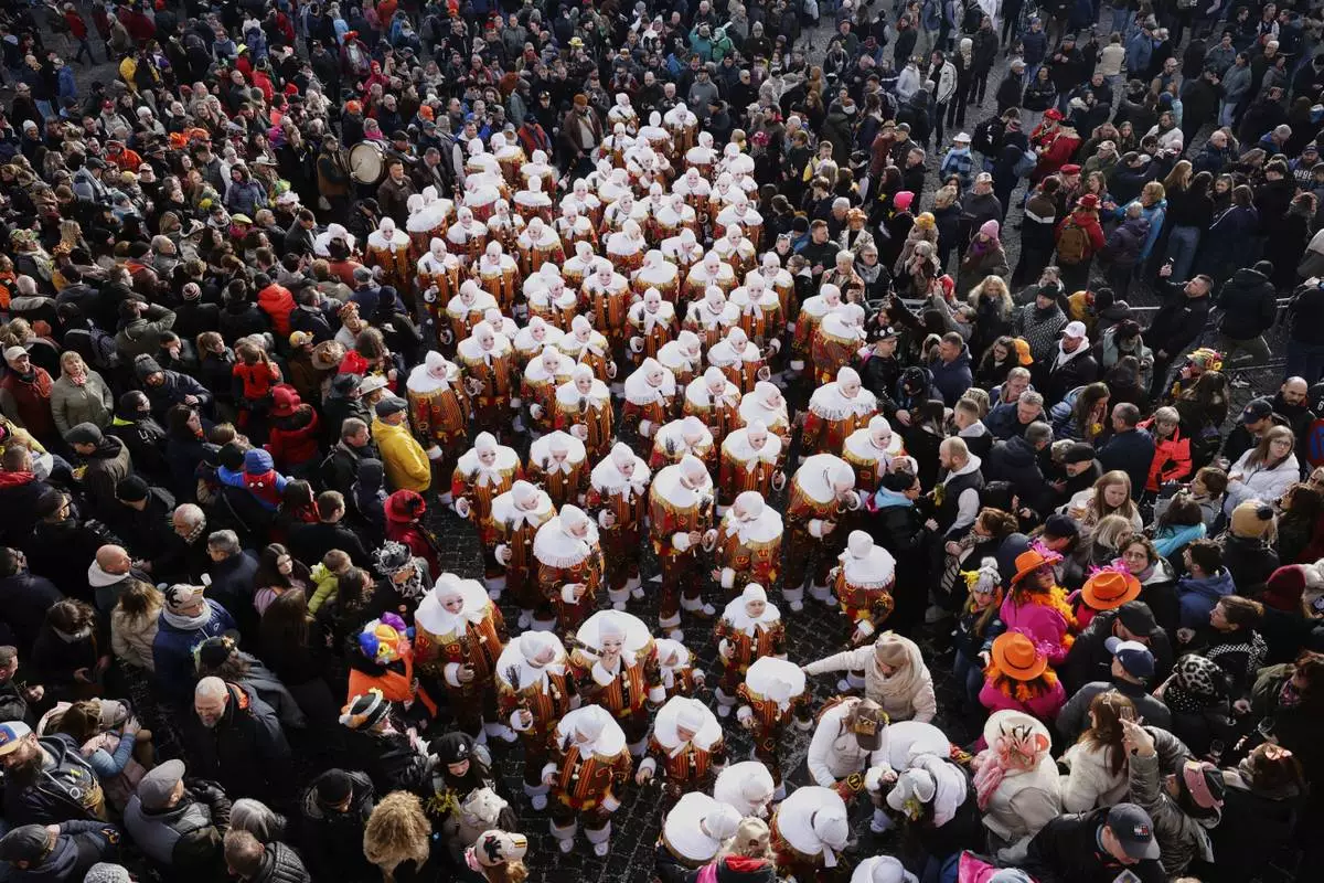 The Gilles of Binche wear their traditional wax masks as they attend Carnival celebrations in Binche, Belgium, Tuesday, March 4, 2025. (AP Photo/Omar Havana)