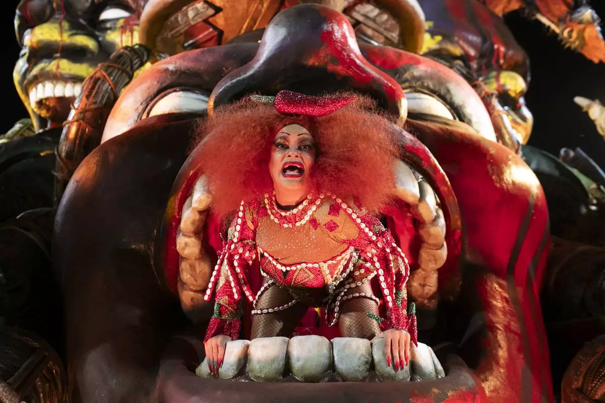 A performer from the Imperatriz Leopoldinense samba school parades on a float during Carnival celebrations at the Sambadrome in Rio de Janeiro, Monday, March 3, 2025. (AP Photo/Bruna Prado)