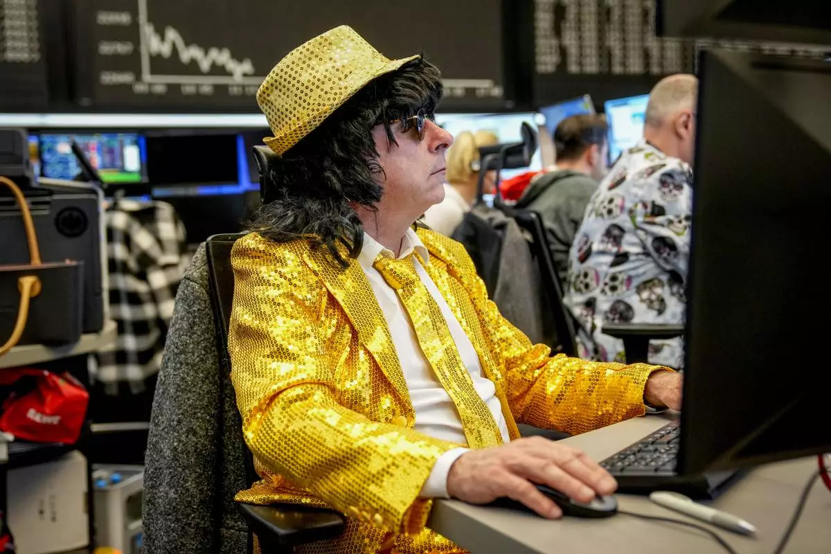A broker watches his screens at the stock market in Frankfurt, Germany, on the traditional Carnival Tuesday, March 4, 2025. (AP Photo/Michael Probst)