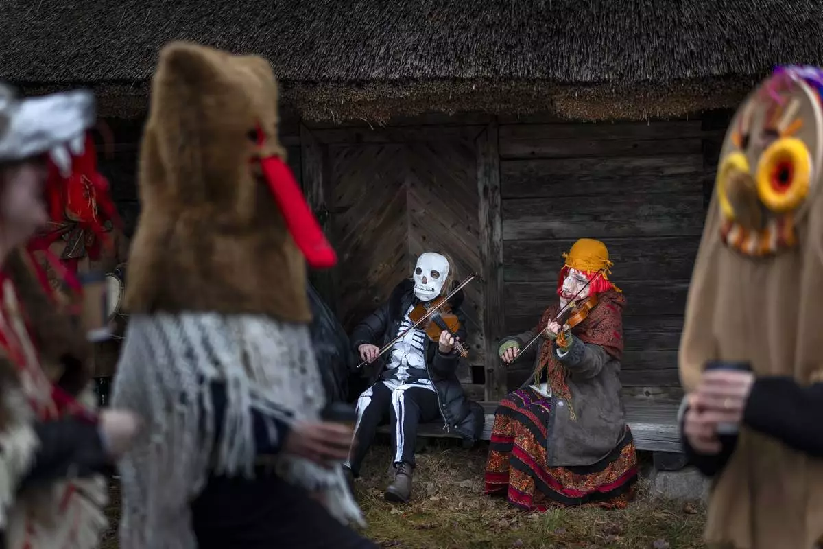 Revellers wearing traditional carnival masks take part in Shrovetide celebrations, in Rumsiskes village, some 89 kilometres (56 miles) north of Vilnius, Lithuania, Saturday, March 1, 2025. (AP Photo/Mindaugas Kulbis)