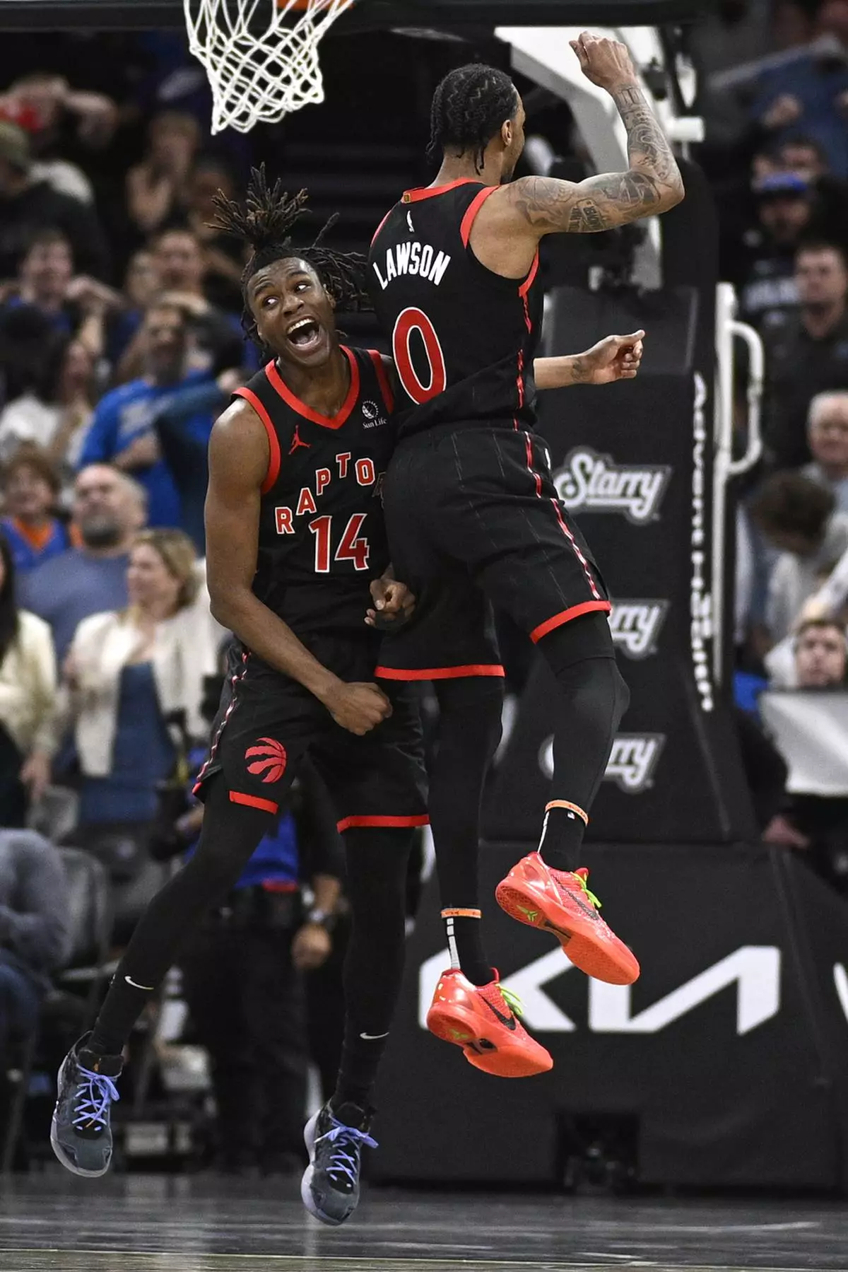 Toronto Raptors guard Ja'Kobe Walter (14) celebrates his game-winning shot with guard A.J. Lawson (0) during the second half of an NBA basketball game against the Orlando Magic, Tuesday, March 4, 2025, in Orlando, Fla. (AP Photo/Phelan M. Ebenhack)