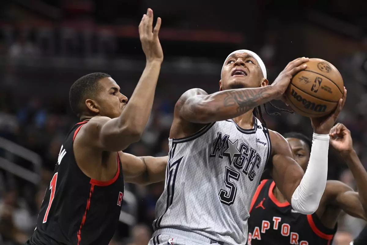 Orlando Magic forward Paolo Banchero (5) tries to shoot as Toronto Raptors center Orlando Robinson, left, defends during the first half of an NBA basketball game, Tuesday, March 4, 2025, in Orlando, Fla. (AP Photo/Phelan M. Ebenhack)