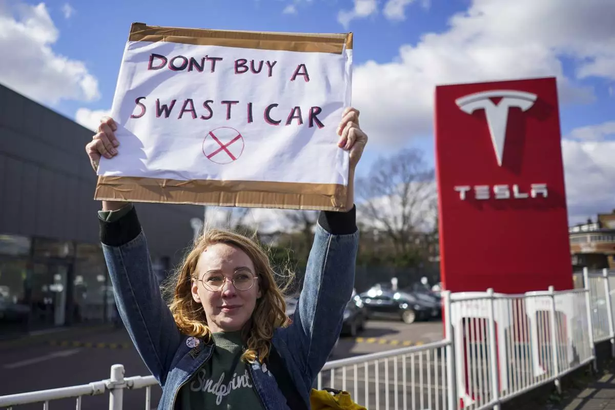 A demonstrator holds a placard outside a Tesla centre, as part of a campaign encouraging people to boycott the brand, in London, Saturday, March 15, 2025.(AP Photo/Alberto Pezzali)