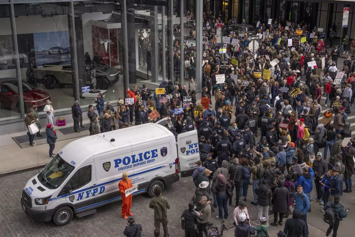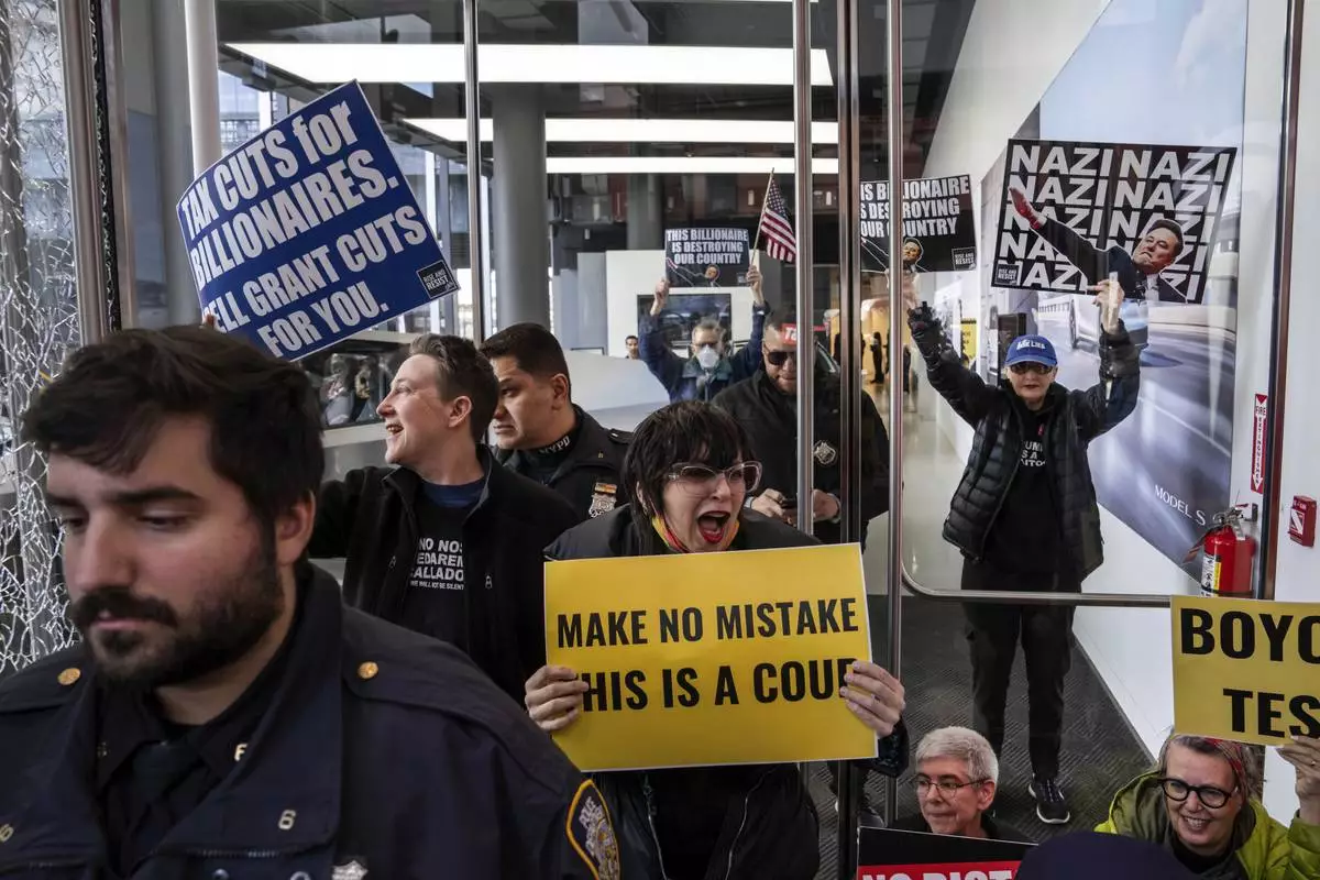 Demonstrators take part in a protest against Elon Musk and Tesla outside of a Tesla showroom, Saturday, March 01, 2025 in New York. (AP Photo/Adam Gray)