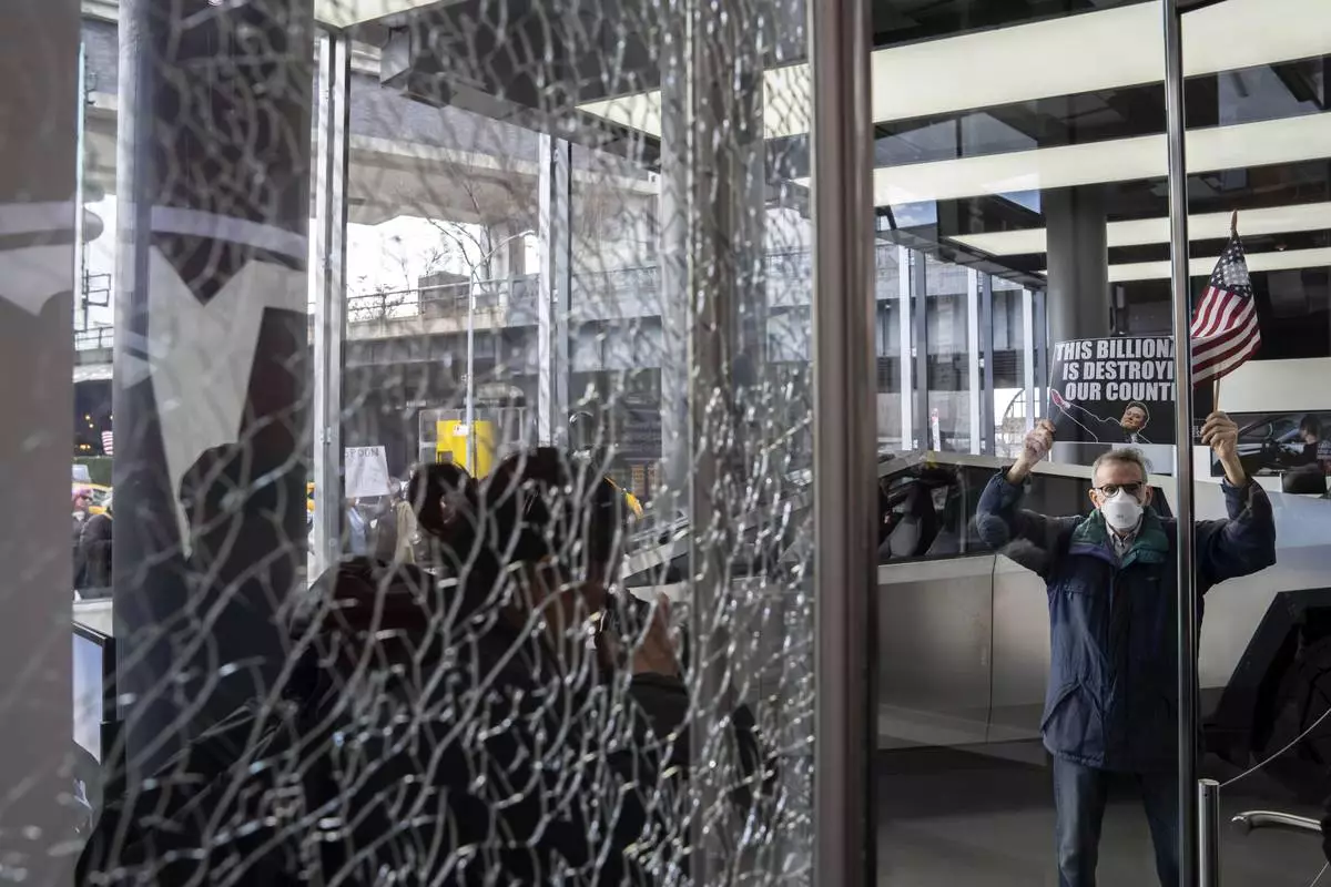 A demonstrator stands inside a Tesla showroom, next to a smashed door, during a protest against Elon Musk and Tesla, Saturday, March 01, 2025 in New York. (AP Photo/Adam Gray)
