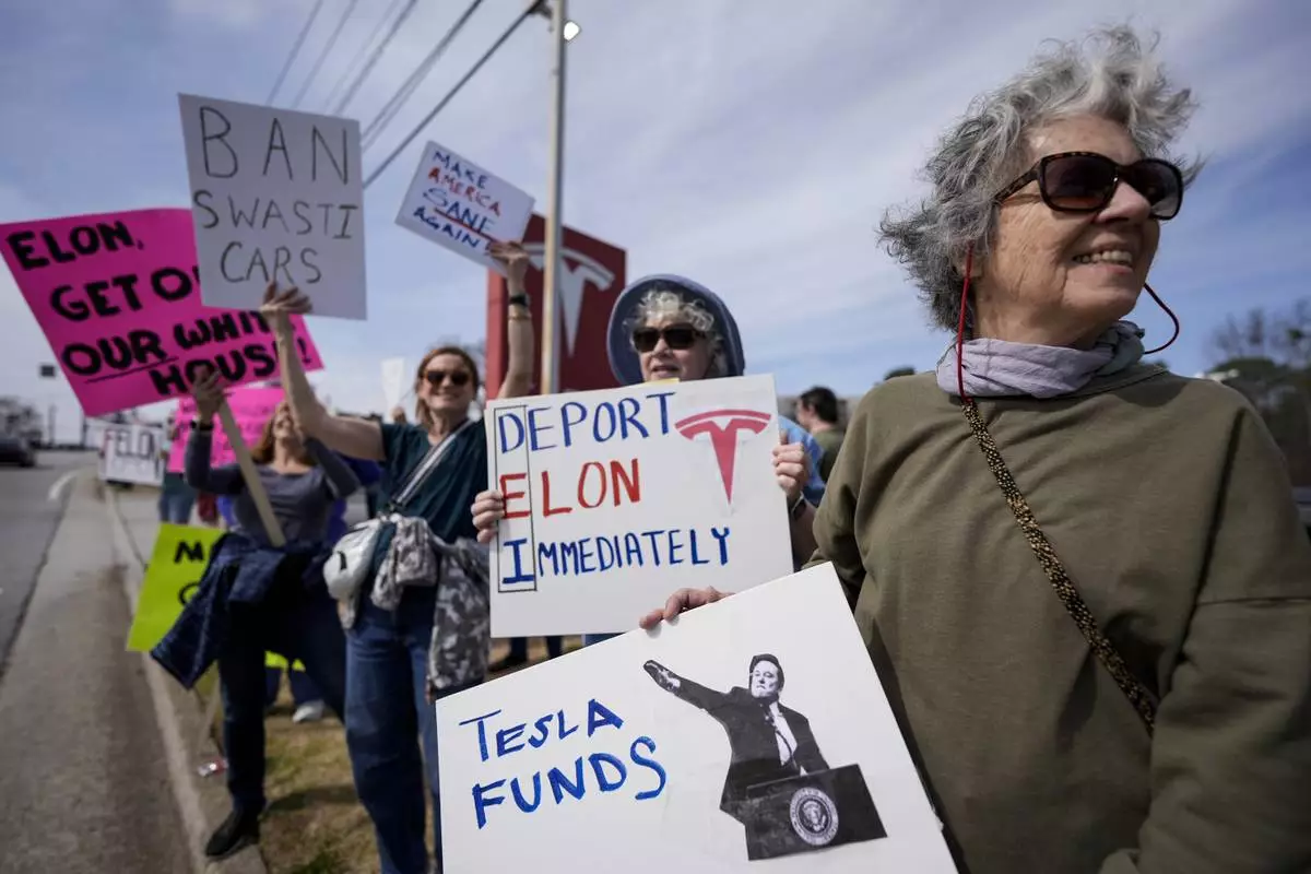 Korinna Hirsch stands with other demonstrators during a protest of automaker billionaire CEO, Elon Musk near a Tesla vehicle dealership, Saturday, March 8, 2025, in Decatur, Ga. (AP Photo/Mike Stewart)