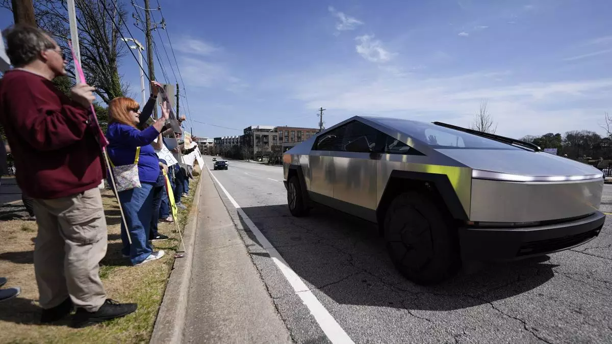 People stand with other demonstrators as a Cybertruck moves by during a protest of automaker billionaire CEO, Elon Musk near a Tesla vehicle dealership, Saturday, March 8, 2025, in Decatur. (AP Photo/Mike Stewart)