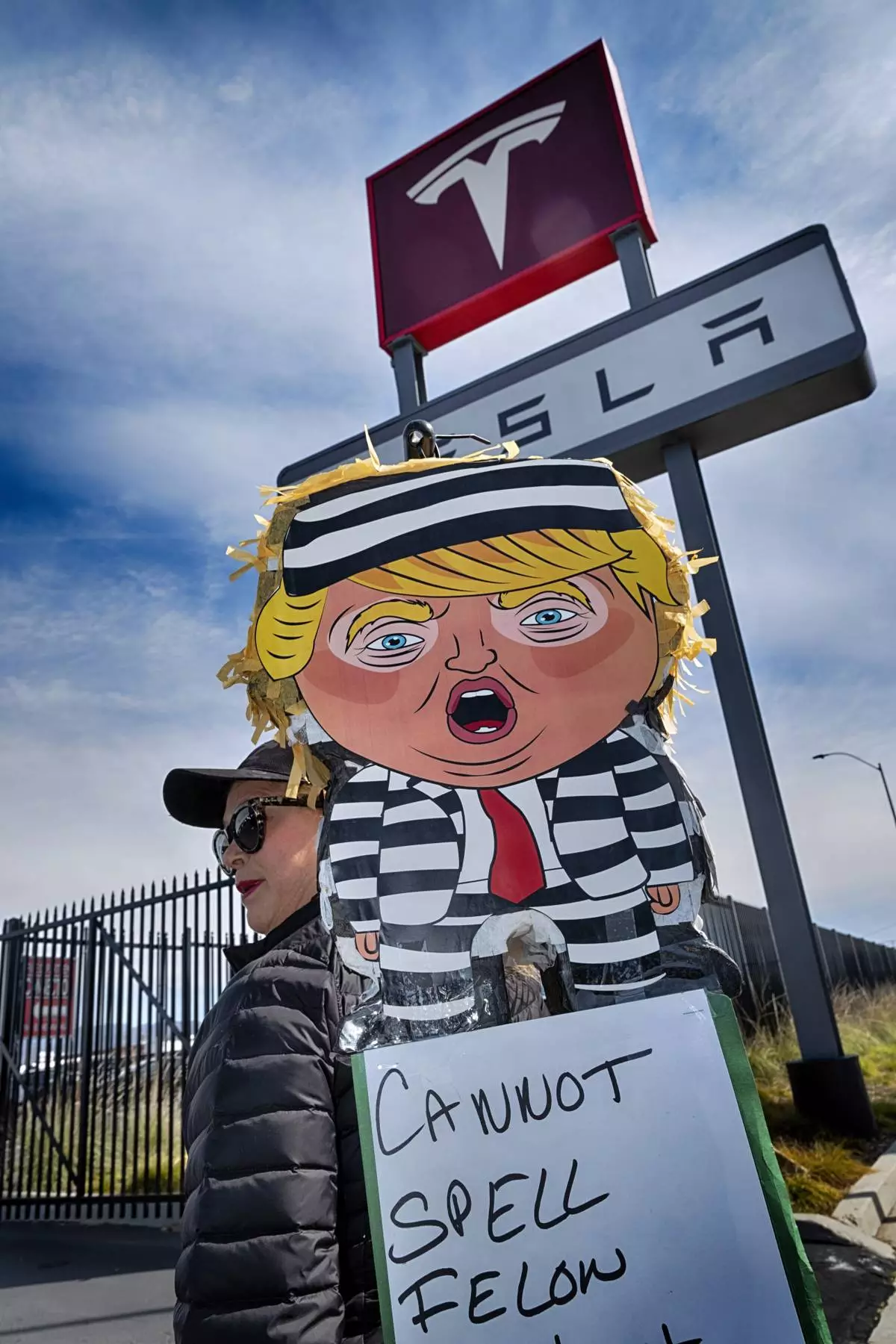 A protester carries a piñata in the likeliness of Donald Trump during a protest outside a Tesla showroom and service center in the North Hollywood section of Los Angeles on Saturday, March 15, 2025. (AP Photo/Richard Vogel)
